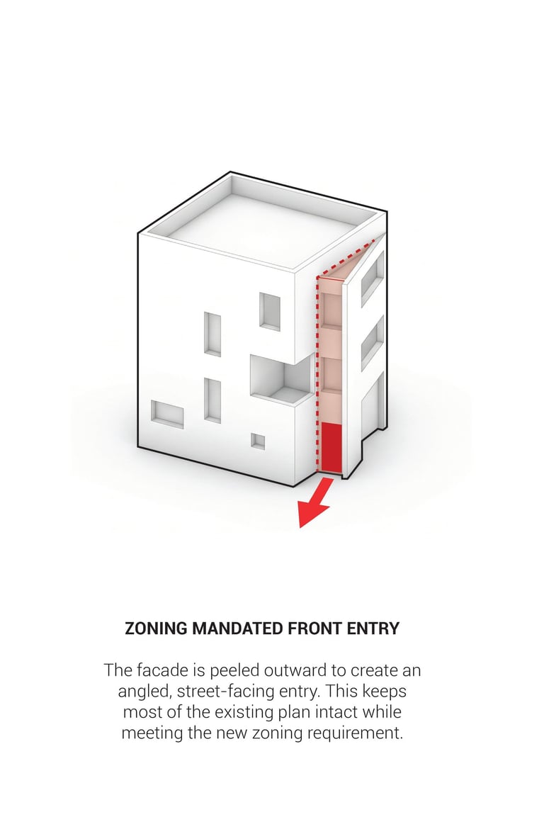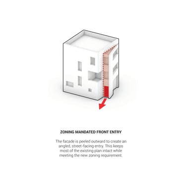 The project began design under the interim code but, by the time of permit submission, the first phase of the permanent code had taken effect. The most significant change was a new requirement for a street-facing entry. Fortunately, staying ahead of the evolving code allowed us to adapt in time. We peeled back the geometry of Unit A to create a new angled entry — a move that also had the unexpected benefit of opening up new southern exposures to the main living space and primary bedroom.