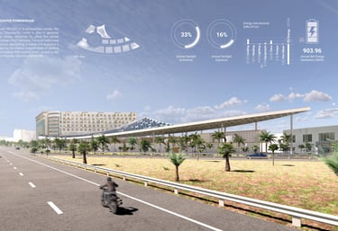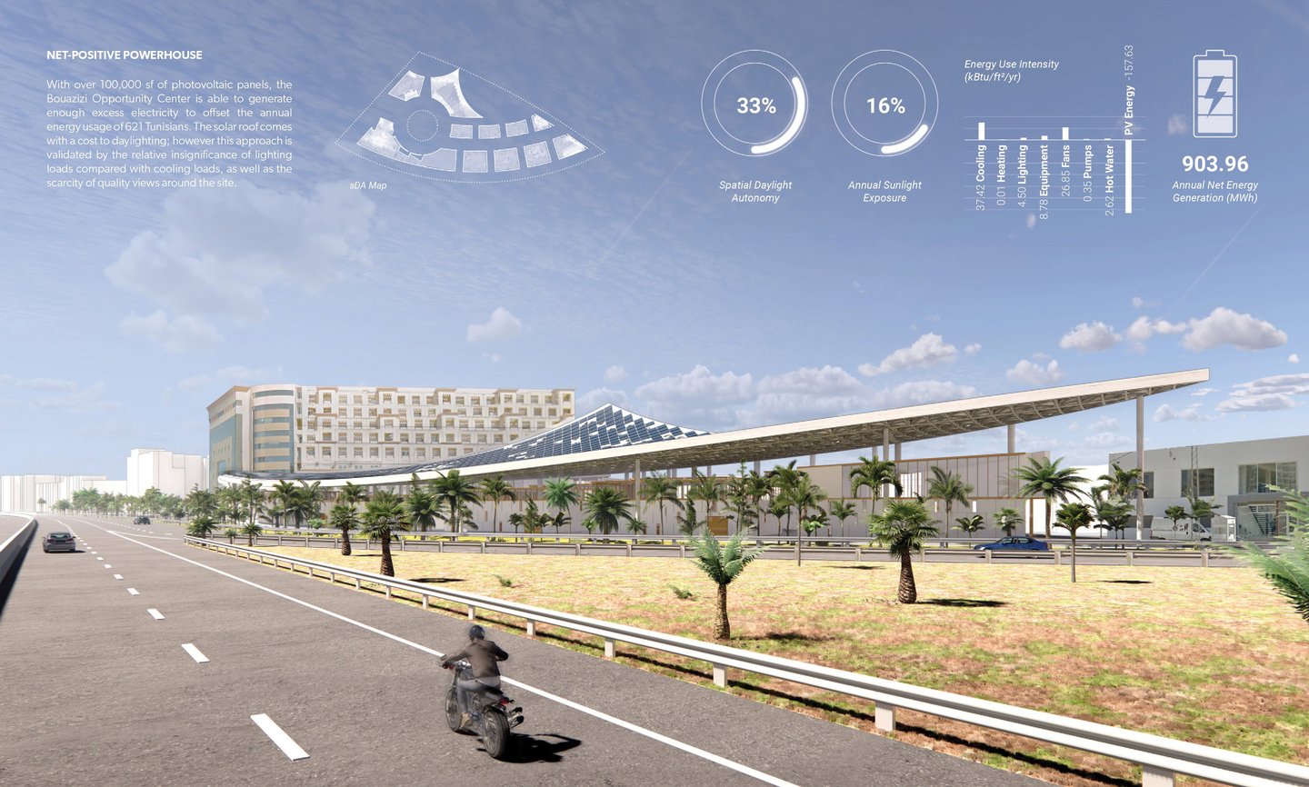 The Bouazizi Opportunity Center is a net-positive energy powerhouse that provides resources for creative skill development, as well as a local and digital marketplace to directly sell goods and services. Located between a busy airport highway and a residential neighborhood, the design addresses two disparate scales with an oversized photovoltaic super-roof and a series of smaller scaled pavilions.