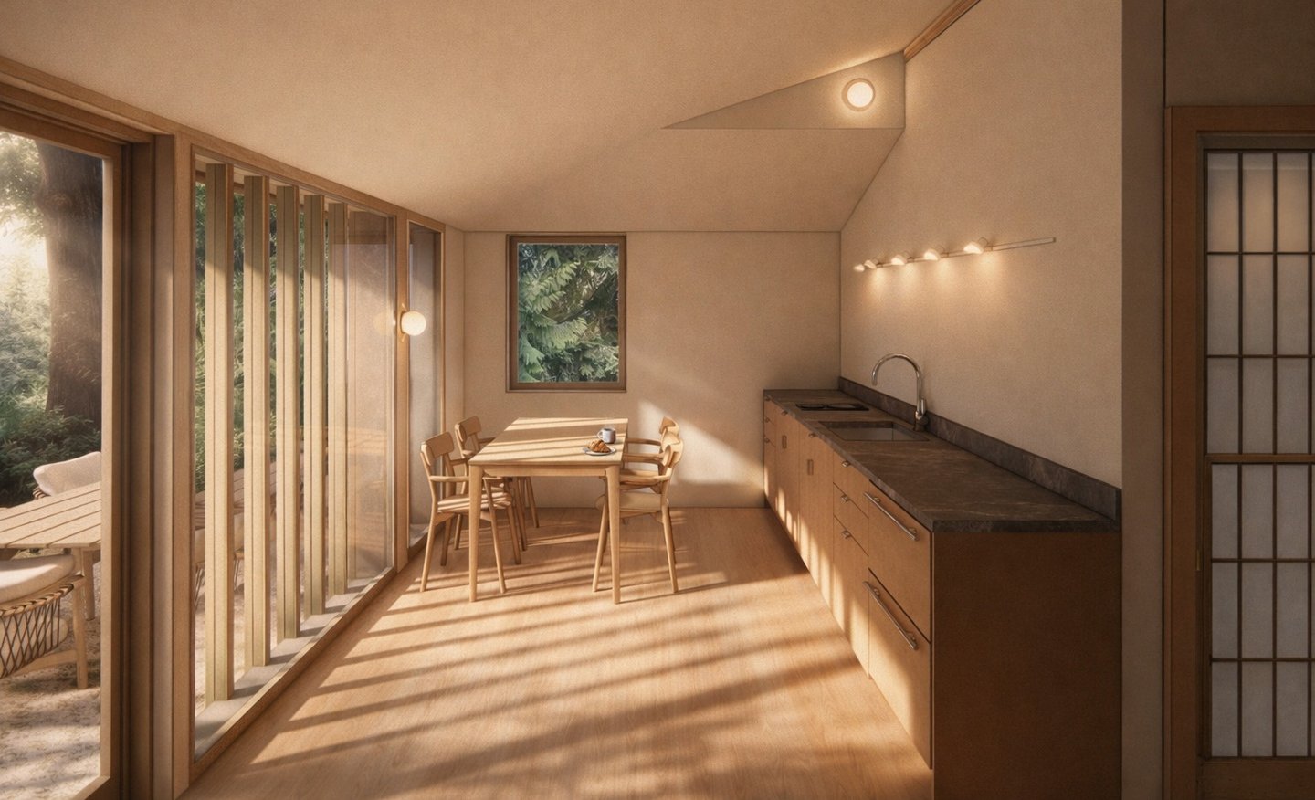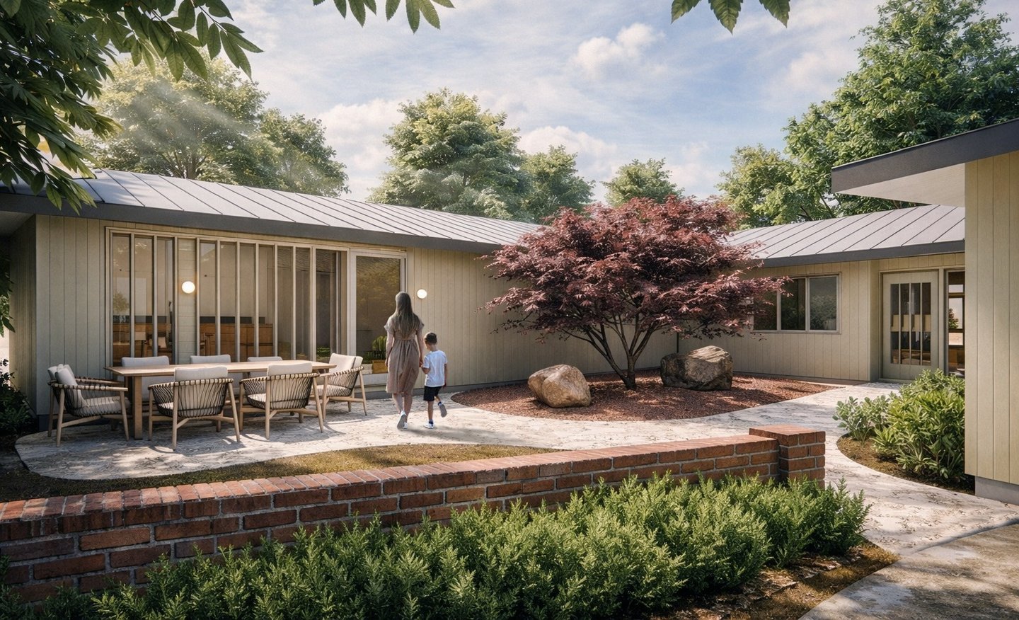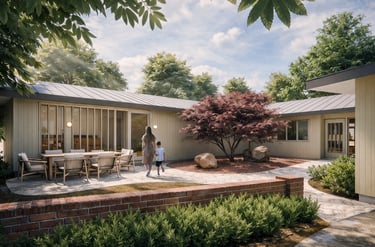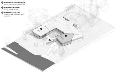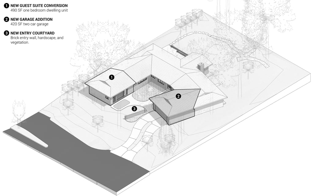 Mercer Modern is a sensitive renovation of a 1960s Pacific Northwest mid-century modern rambler. The project converts an unconditioned garage into a simple, elegant living space, while a reconfigured site entry creates a new central courtyard for family gatherings. Finely tuned energy upgrades support generous vaulted ceilings while retaining the home’s defining Dutch gable roofline. An existing motif of vertical wooden fins is extended across the new additions to create a cohesive, integrated development.