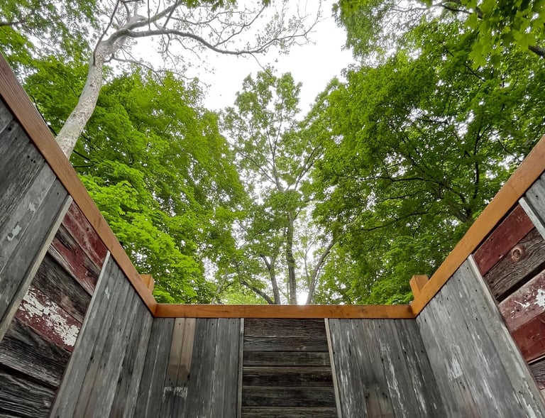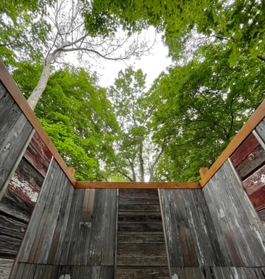 The Allerton Nature Boxes are the product of a design-build studio with only 5 weeks of construction time. Each of the three extended box frames are clad with century-old wood siding taken from the site, and offer new vantage points to a tree and the nearby Sangamon River. The siding was all reclaimed from a nearby 100-year old chicken coop that had fallen into disrepair.